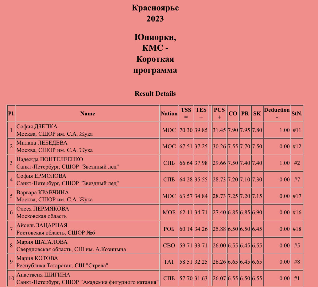 В рамках уже третего этапа Гран-при России фигуристки-юниорки представили свои короткие программы. К хорошему быстро привыкаешь, и запредельная сложность уже становится обыденностью. Этот этап нельзя назвать супер-сильным по составу. Однако уровню спортсменок уж точно позавидует чемпионат Европы. Что и подтверждает промежуточная турнирная таблица. София Дзепка практически идеально чисто исполнила свою программу. Постановка насыщенна сложными связками и переходами. С прыжками справилась хорошо, единственное, выезд на каскаде был не самый уверенный. Все было прекрасно … И стоило же упасть на финальной позе, уже практически завершив свою программу. София еще так неприятно упала на спину, надеюсь не ушиблась. За прокат спортсменка набрала 70.30, промежуточное первое место. Милана Лебедева. Очень легко, изящно, грациозно. Спортсменке очень идут восточные мотивы. Интересная постановка, насыщенная интересными фишечками. Мне показалось, что каскад был даже уверенне, чем у Софии, но судьи отме