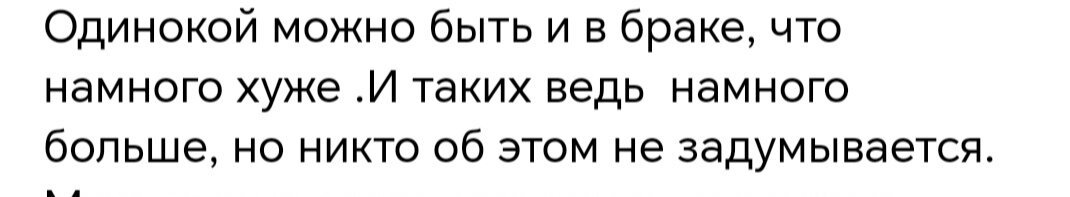 Я долго размышляла на эту тему. Почему так? Что движет женщиной или мужчиной, жить с нелюбимым человеком, с которым ты остаёшься по сути, одиноким. Ради чего?