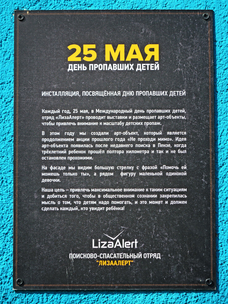 Продолжаю обзоры образцов самарского уличного искусства. В очередной подборке приглашаю посмотреть на один из новых муралов, появившихся в городе в 2023 году. Улица Урицкого, 30. На фасаде этого дома в конце мая была открыта инсталляция, посвящённая Дню пропавших детей. Он отмечается 25 мая (насколько слово «отмечается» здесь может быть уместным). Акция прошла по инициативе волонтёров поисково-спасательного отряда «ЛизаАлерт». Автор рисунка - художник Дмитрий «Пирог» Горшков. В текущем году он создал ещё два мурала. Один из них я уже показал. Второй пока остаётся в планах. Рисунок, о котором идёт речь здесь, на самом деле правильнее называть инсталляцией. Главный смысловой его элемент - силуэт маленькой девочки - вырезан из листа металла, а не нарисован. Это придаёт общей композиции особую выразительность. Единственное, чего я не понял, - цветовое выделение в слогане. Серию обзоров образцов уличного искусства продолжу чуть позже. Спасибо за просмотр и оценку. Не забывайте, что ваша реа