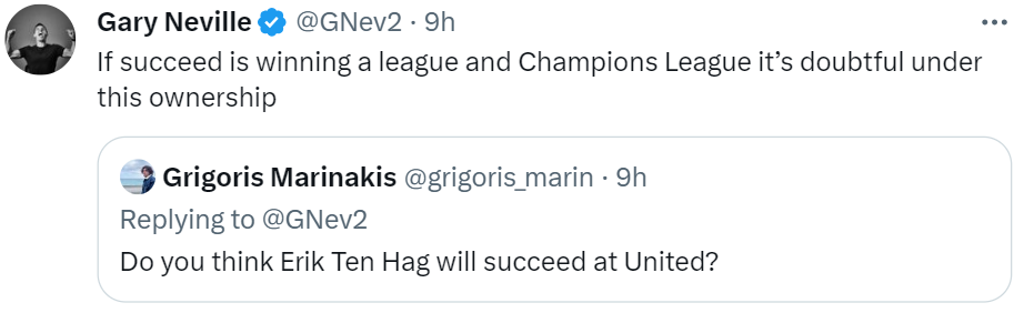Гари Невилл устроил для болельщиков сюрприз. Экс-защитник «Юнайтед» ответил на несколько вопросов подписчиков в твиттере. Невилл говорил честно и откровенно, порой не стесняясь в выражениях. Первым делом Гари прошелся по руководству «красных дьяволов». Фанат: «Как думаешь, обретет ли Тен Хаг успех в «Юнайтед»?» Невилл: «Если под успехом подразумевать победу в чемпионате и Лиге чемпионов, то с таким руководством ставлю этот успех под сомнения». Ф: «Лучший тренер после сэра Алекса?» Н: «Все они хороши, но всем мешали владельцы, отсутствие хорошего руководства и плохой подбор персонала». Ф: «Тебе когда-нибудь было неловко из-за того, что ты обвиняешь Глейзеров каждый раз, когда «Юнайтед» выдает несколько плохих матчей?» Н: «Стали бы вы винить детей, если бы плохо себя вели в течение 12-ти лет, или стоит обратить внимание на родителей?» Ф: «Гари, что ты считаешь главной проблемой нынешнего «Юнайтед»?» Н: «Владельцев и плохое спортивное управление». Невилл поделился ощущениями от текущего с