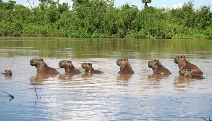 Капибары обычно занимаются тем, что едят, спят и играют. Они также могут плавать и нырять в поисках пищи. Несмотря на то, что водосвинки активны в основном утром и вечером (когда не так жарко), если их постоянно будут тревожить люди или хищники, капибары без особых проблем перейдут на ночной режим. По своему характеру водосвинки чрезвычайно флегматичны, можно даже сказать – ленивы. Когда зоологи попытались в своё время отыскать логово этих зверей, найти его долгое время никак не могли. А всё потому, что никакого жилища у них попросту нет – спит капибара на земле. Максимум, на что она согласна – это разрыхлить почву под собой и сделать неглубокую ямку. Живут водосвинки стаями – от десяти до двадцати особей, хотя во время жары возле одного водоёма нередко может собраться более сотни грызунов. В этом случае нередки конфликты между постоянными обитателями и пришедшими. Согласно исследованиям учёных, капибары умеют отличать когда другие звери хотят их съесть, а когда нет. Поэтому даже если