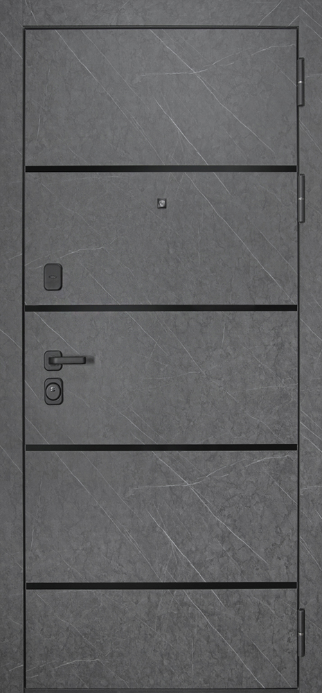 Петли: 3 петли с подшипником. Внешняя отделка: лист металла 1,5 мм. Экошпонированная панель МДФ 10 мм (цвет «гранит лава дым»), декоративные горизонтальные пластиковые вставки 20 мм (цвет “черный”), наличник МДФ гладкий, 80 мм (цвет "гранит лава дым")