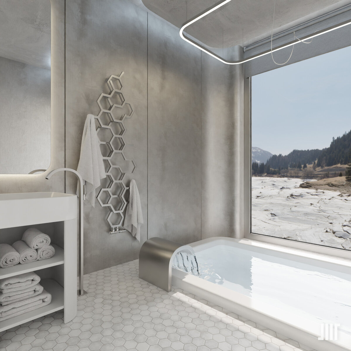Космические масштабы, словно нарушающие физические законы формы, а также материалы и технологии будущего — всё это — футуризм. Он может быть с отсылкой к ретро-стилю из кинематографа про будущее с летающими кораблями и инопланетными существами, а может быть и современным, близким к сегодняшнему дню, но с отголосками грёз о заорбитном мире будущего. Сегодня мы покажем вам интерьерные вариации на тему футуризма и предложим несколько органичных элементов отопления подобных по стилю пространств. Ванная комната Футуристичная ванная комната может быть разной: обтекаемой или, напротив, гипертрофированно-угловатой, гладкой и изящной или очень фактурной и многослойной. Мы видим её как ансамбль из стали и камня, со смешением тёплых и холодных оттенков света, метафорическими деталями и предметами мягких форм. В нашем варианте ванной комнаты в космическом стиле напольная мозаика из гексагональных плиток, отсылающая к молекулярной структуре графена, поддержана полотенцесушителем HEX от бренда Terma