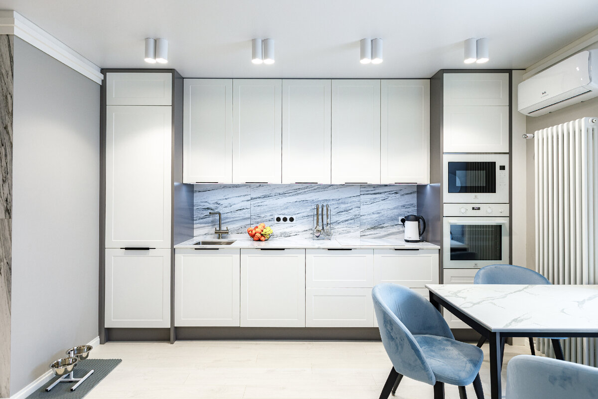 Монохромный дизайн кухни выглядит стильно, когда в нем работают сразу несколько оттенков одного цвета.