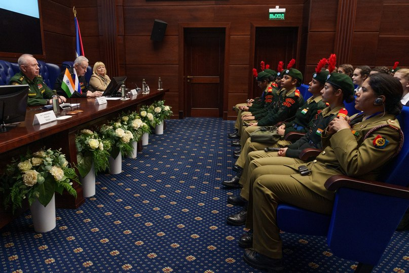 ▫️ После экскурсии с делегацией встретился и побеседовал заместитель Министра обороны Российской Федерации генерал-полковник Александр Фомин. Он рассказал участникам встречи об истории российско-индийского военного сотрудничества и ответил на вопросы ребят о взаимоотношениях России и Индии.