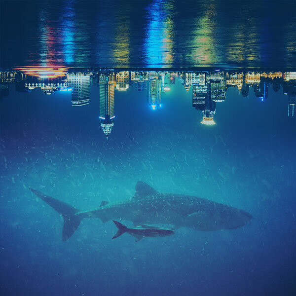В этом коллаже мы соединим несколько фотографий, чтобы получить фантастический и даже сюрреалистический сюжет. Приступаем. Создаем в фотошоп (Ctrl+N) новый документ с параметрами, как на рисунке ниже. Помещаем в документ (Файл-Поместить встроенные) изображение «Город» из папки с исходниками. Переходим в меню Редактирование-Трансформирование-Отразить по вертикали. Активируем инструмент Перемещение. Зажимаем клавишу Shift и перетаскиваем слой «Город» в верхнюю часть холста. Активируем инструмент Прямоугольная область. Создаем выделение, как на рисунке ниже. При активном выделении нажимаем сочетание клавиш Ctrl+J, чтобы скопировать выделенную область на новый слой. Переименовываем образовавшийся слой в «Город 2». Чтобы переименовать слой, дважды щелкните по имени слоя в панели слоев, введите новое имя и нажмите клавишу Enter. Вызываем Свободное трансформирование (Редактирование-Свободное трансформирование или Ctrl+T). Тянем за нижний ползунок вниз, чтобы растянуть слой «Город 2» и заполни