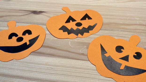 Предлагаем три простых варианта поделок из бумаги на Хэллоуин. Обязательно делаем с детьми, развивая мелкую моторику. Даже если опустить историю праздника, мастерить тыквы ярко-оранжевого цвета очень позитивное занятие. Вам понадобится цветная бумага оранжевого и зелёного цвета, оранжевый и чёрный картон, толстый картон для изготовления шаблона, линейка, ножницы, простой карандаш, клеевой карандаш (степлер по желанию). Вариант бумажной тыквы № 1 Лист цветной бумаги расчерчиваем на полоски шириной 0,8-1 см и нарезаем. В зависимости от размера тыквы лист А4 размечайте вдоль или поперёк. Дальше 2 варианта - «прозрачный» вариант из 4 полосок, или плотный из 8 полосок. Каждую полоску складываем пополам, намечая серединку - место скрепления. Дальше или склеиваете, или степлерите. Затем хвосты аккуратно загибаем и склеиваем (или опять же степлерим), формируя тыкву. Сверху приклеиваем листочки. Вариант бумажной тыквы № 2 Лист А4 складываем втрое по длинной стороне, затем перегибаем пополам и в