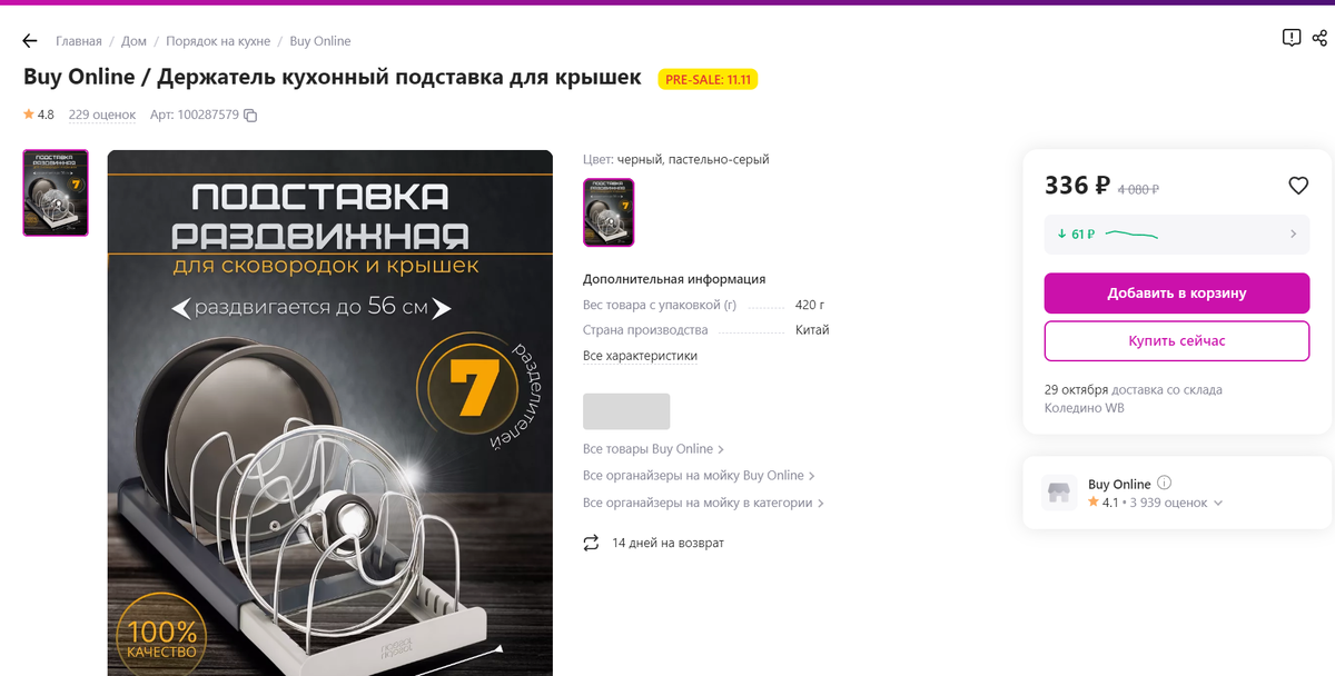 Даже на современной, большой кухне места для хранения всегда будет мало. Но мы с вами живем в 21 веке (слава Богу), и есть различные решения. Сегодня покажу Вам 5 самых крутых товаров с Вайлдберис до 500р, которые помогут грамотно организовать пространство на вашей кухне. Поехали! 1 Подставка для крышек и сковородок. Цена 336р. Из всех подставок для крышек, именно на этой модели самые хорошие отзывы. Покупатели удивлены многофункциональности этого товара. Но все просто, под каждую крышку можно отрегулировать размер индивидуально. Многие покупают эту подставку под крышки, а хранят таким образом сковородки. Оценили эту модель почти 229 человек, средняя оценка 4,8 из 5. Так же покупатели отмечают: Порядок в ящике со сковородками и крышками с такой подставкой обеспечен, а значит, это то что надо! Артикул: 100287579 2 Дополнительная полка в шкаф (раздвижная) Цена 508р Эта вещь расширяет функционал обычной полки. Ее ширина регулируется от 33-57 см , 22 см высота и 15 см глубина. Скорре