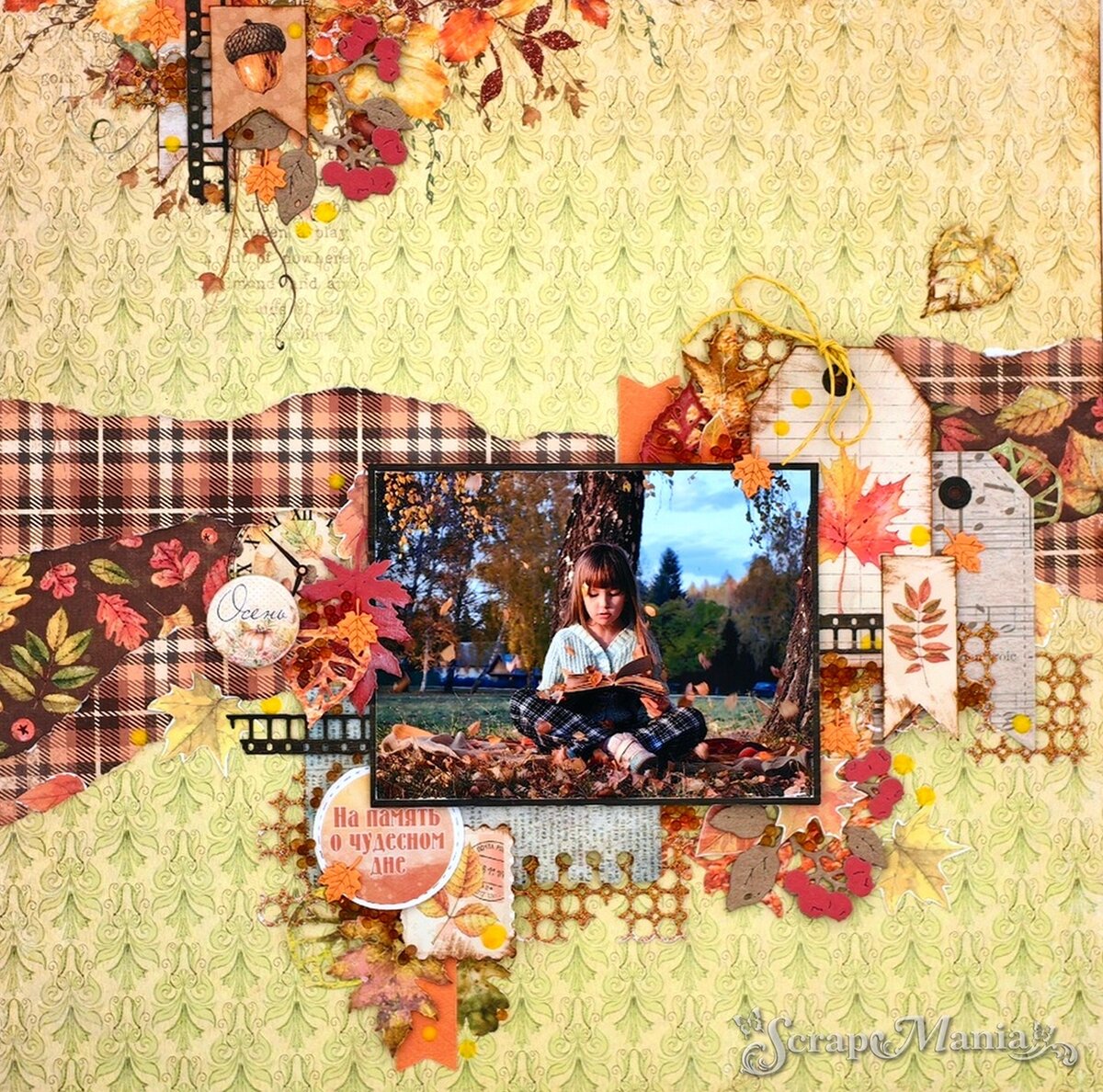 Доброго всем дня. С вами Рамзиля. Очень люблю осень! Не потому, что я родилась в это время года, а просто за красоту и яркие краски! А как красиво, как правильно описал состояние осени в своем стихотворении А.С.Пушкин: Унылая пора! Очей очарованье! Приятна мне твоя прощальная краса- Люблю я пышное природы увяданье, В багрец и золото одетые леса. И вот в один из осенних дней мы с дочерью решили выйти на фотосессию, сделать "пару снимков". А с одним из самых, на мой взгляд удачных, захотелось сделать скрап страничку. Ее размер 30х30см, смиксовала две осенние коллекции: "Щедрая осень" и "Уютная осень". В центре, на подложке из плотного дизайнерского картона, фотография 9х13см. Основной фон - лист "Щедрая осень.Мгновение", в слои добавлены листы из набора, а еще часы из листа с картинками 10х30 "Уютная осень.Часы", фишка из набора "Красота" Добавила ажурные листья (вырубка из набора ножей "Школьный листопад"), теги из листа бумаги"Уютная осень", на одном из которых завязан на желтый