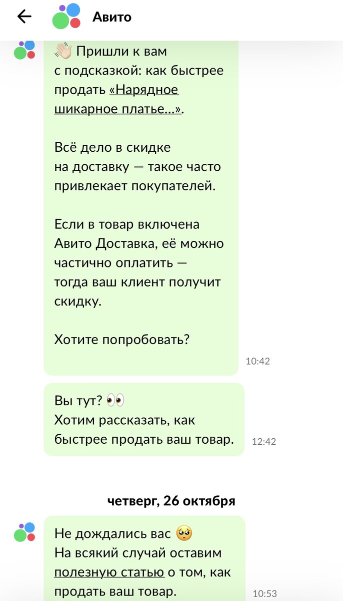 Всем привет! На днях Авито решил поучить меня жизни. Дескать, неправильно я продаю, даром преподаватели время со мною тратили. И решил мне подсказать, как действовать, если я хочу хоть что-нибудь уже продать. Несколько дней спамил меня сообщениями. И всё, конечно, замечательно, если бы не тот факт, что подсказать он мне решил именно по тому товару, который уже ехал к покупателю 😂 Сегодня уже получила деньги: за вычетом комиссии получилось 1853 рубля. Отправила в накопления. Продала очень красивое детское платье. Там пышная юбка и длинный шлейф, поэтому в шкафу оно занимало довольно много места. Покупала 5 лет назад на ВБ почти за 5 тысяч. Вывесила на продажу я его ещё прошлой зимой. У меня не получалось найти момент, чтобы сделать качественные фото при дневном свете, поэтому вышло то, что вышло. Называется, почувствуй разницу. Вот одно из фото предыдущего объявления: А вот это уже апгрейд: сфотографировала нормально, почти через год (!) Так чувствуется лёгкость и воздушность, а это