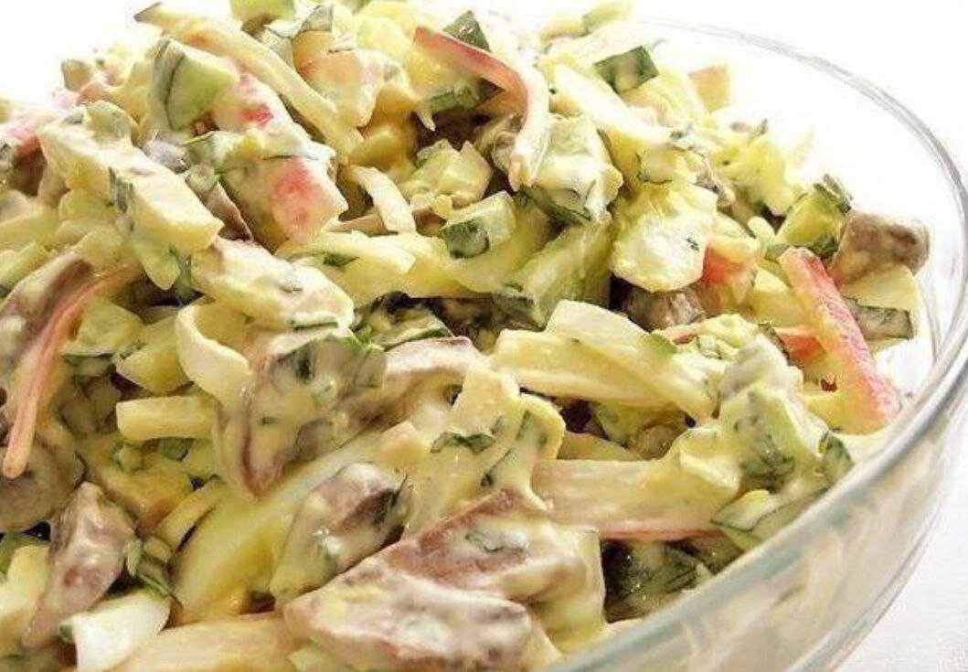 1. Грибы поджарить с луком. Огурцы порезать кубиком. Крабовые палочки - соломкой, отварить яйца и нарезать кубиком.