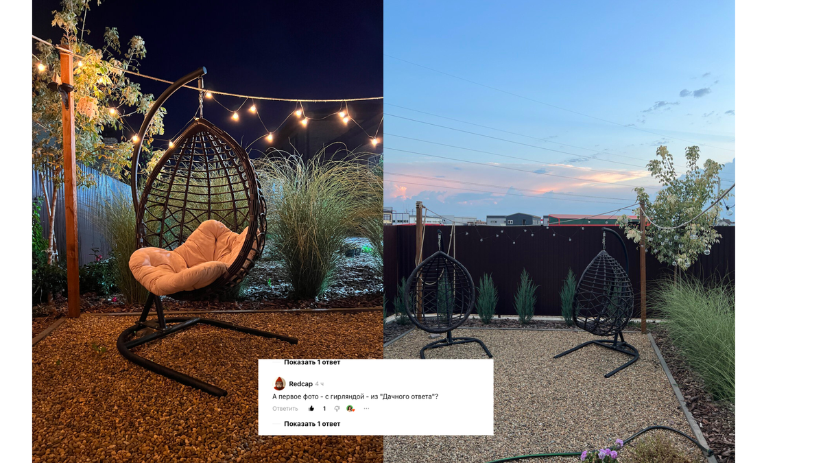К осени 2022 года у нас на площадке появился только мангал и первое кресло-качеля. Развешиванием гирлянд мы не занимались. А перенесли на весенний сезон 2023 года.