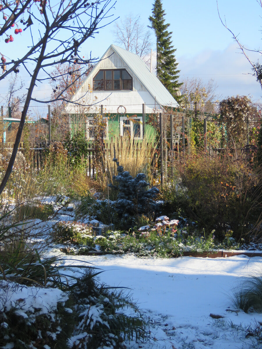 За забором хихикал сад. Я прямо ощущала, как он угорает, лицезрея меня и замерзший замок вне себя. Видимо кто-то не хотел укрывать свои 4 розы и расставлять ящики над рододендроном и туями. И семена отдавать не хотел, чую, жадина🤣 Ну, вы поняли, да? Я лезла через забор. Сад ржал..я страдала, но форсировала преграду, стараясь с преградой в обнимку не навернуться, вокруг стаями носились снегири, не давая себя сфотографировать. И все ради роз..шучу. Возвращаться, поцеловав замок, просто не хотелось😁 Аконит и алыча притворяются, что они живы. И, вообще -какая зима?! Остальные зиму прочувствовали, да Кто-то уже перешел в режим "зимняя графика" А кому-то вот не хватило осени...чтобы закончить вегетацию НОРМАЛЬНО. Некоторые удивились выпавшему снегу Ну а сад? Сад радует желто-оранжевой гаммой... И заснеженными дорожками.. Ему я не нужна уже🤣, но забрать нужное мне необходимо. Поэтому, пусть еще пару раз потерпит. Но теперь я ученая - без размораживателя из дома не выйду. А то, ишь ты, по