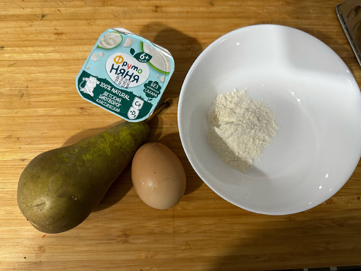 Ингредиенты: яйцо 1шт мягкий творожок классический груша 1шт мука 0,5ст.л. 1. Разбиваем яйцо, добавляем творожок классический, натираем на крупной терке грушу, добавляю половину столовой ложки муки и тщательно все перемешиваю. 2. Далее укладываем в противень( у меня силиконовый коврик на дне) также можно разложить по формочкам. 3. Отправляю в духовку на 180 градусов на 20-30 минут в зависимости от духовки. Нарезаем на небольшие кусочки и подаём нашему гурману. Приятного аппетита Вашим малышам💕 ⚠в рецепте присутствуют аллергены, вводить отдельно микродозами, а только потом можно соединять и готовить блюда ⚠