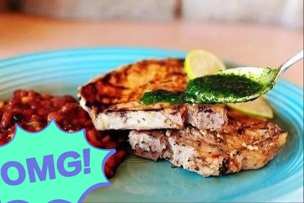 - 6 свиных отбивных - 2 чашки апельсинового сока - сок от 2 лаймов - 5 зубчиков чеснока, измельчить - 2 чайные ложки тмина - 1/2 ч.л. красный перец - 1 столовая ложка сушеного орегано - 1 маленькая луковица, разрезать пополам и нарезанный тонкими полукольцами Для соуса: - 1 пучок кинзы - 1 пучок петрушки - 1 стакан оливкового масла - соль и перец по вкусу 1. Смешать в небольшом плотном пакете апельсиновый сок, сок лайма, чеснок, тмин, красный перец, орегано, резанный лук 2. Положить туда свиные отбивные , хорошенько перемешать и оставить на ночь мариноваться 3. Достать из маринада, обжарить с двух сторон до готовности 4. В блендер добавить пучок кинзы, пучок петрушки, оливковое масло, соль и перец и смешать все до однородной массы 5. Подавать отбивные с соусом из зелени и консервированной фасолью чили.