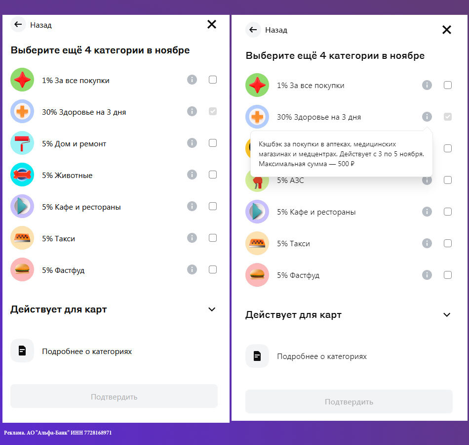 Вот уже полгода Альфа-Банк дает деньги всем желающим на покупки в определенной категории в определенные дни. И в ноябре это любые товары из категории «Здоровье». Соответствующее оповещение появилось в личных кабинетах пользователей. Кэшбэк на покупку товаров из этой категории на двух моих аккаунтах составляет 30%. В предыдущие месяцы размер кэшбэка иногда отличался на разных аккаунтах, поэтому не могу утверждать, что 30% будет у всех. Максимальная сумма возврата – 500 рублей. Если у вас уже есть карта Альфа-Банка, нужно просто зайти в личный кабинет и выбрать категории кэшбэка, после подтверждения вам так же станет доступен возврат на лекарства и другие товары для здоровья. В эту категорию попадают все аптеки, но не только. Вы можете посмотреть МСС коды интересующей вас точки продаж и сравнить с указанными кодами, на которые распространяется акция. Если вы еще не являетесь клиентом банка, то можете заказать бесплатную дебетовую карту по ссылке с промокодом на 1000 рублей здесь. Реклам