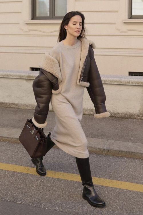 Всем привет, с вами автор канала Даша. Платье - свитер, трикотажные платья - это максимально женственно, элегантно и в тоже время крайне тепло и комфортно. И я решила собрать для вас различные варианты подобных платьев и с чем их можно сочетать. Очень красиво выглядят простые свободные модели длины миди, сочетать их можно с сапогами - трубами, казаками, различными ботинками. Модели с выраженной талией или же с добавлением ремешка сразу же красиво моделируют фигуру, длина миди в сочетании с элегантной обувью добавят пару лишних сантиметров роста. Платья спокойных оттенков можно сочетать с различными пальто, шубами - это уже зависит от погоды в вашем регионе. Такие образы идеально подходят и для офиса, и для прогулок, и для выходов на какие-то мероприятия, настолько это универсальный вариант. Для расслабленных будничных образов можно выбрать более свободные модели, идеально для недолгих прогулок тёплой зимой. А вот для выходов в свет прекрасно подойдут более потопленные модели