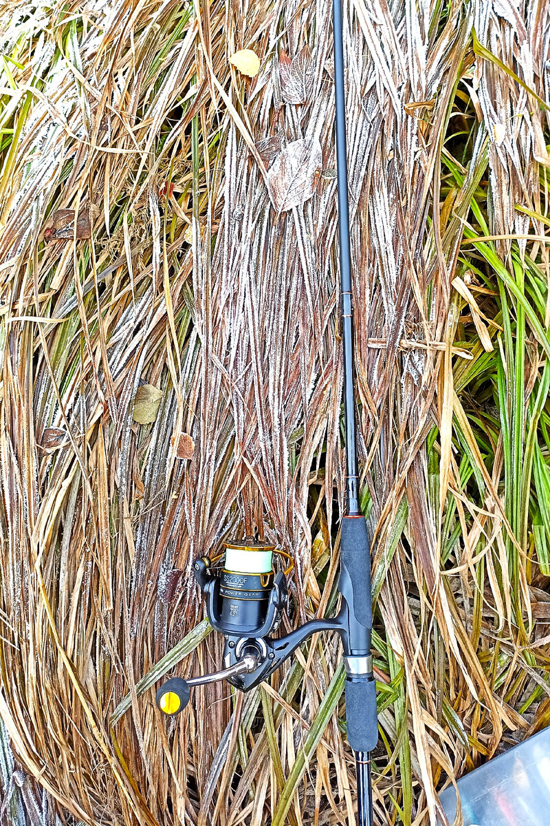 Картинка меня порадовала, но я надеялся на то, что на моей речке достаточно сильное течение, и лед если и есть, то рыбалке мешать не будет. Так и оказалось, хоть прибрежная трава и была покрыта изморозью,