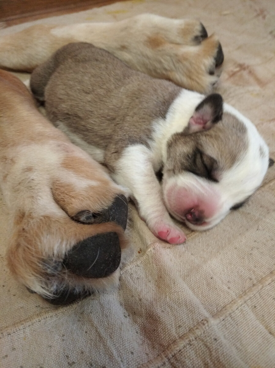 Мне очень нравится эта фотография. Вот суточный щенок среднеазиатской овчарки на фоне лап его матери. Какой разброс размеров! Даже не верится, что из такого крохи может вырасти свирепый огромный волкодав. Как обещала, напишу, какие имена мы в итоге выбрали для деток. Начнем с палевых - это светлые щенки . Их трое. Джай - кобель, у него два пятнышка на шее сзади Десанка - сука, у нее "палец Всевышнего" на лбу. Это такое пятнышко ровно посередине головы на белом. С этим пятном у азиатов есть красивая легенда . …И приложил ему палец Всевышний на голову и сказал: - «Слаб Человек, будь с ним рядом. Если поймёт Человек тебя, отдай жизнь за него! ... И именно ты, мой пёс, никогда не будешь повторим, как не может быть повторим Человек»… …И никто еще не видел, хотя бы двух одинаковых АЛАБАЕВ! Красиво , правда? Я когда вспоминаю у меня начинает предательски щипать в носу и увлажняются глазные яблоки. Сентименты они такие. Буквально в двух словах все объяснено . Дакота - сука палево-белая тоже,