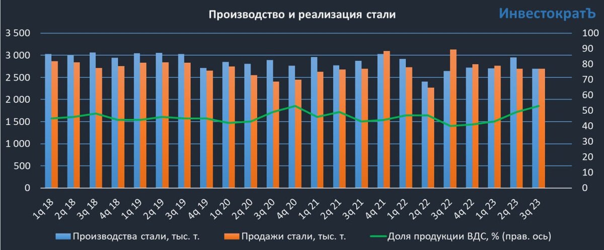В частности, эмитент перестал раскрывать среднюю цену реализации стали, но сохранил данные по объему производства и продаж, давайте с них и начнем.