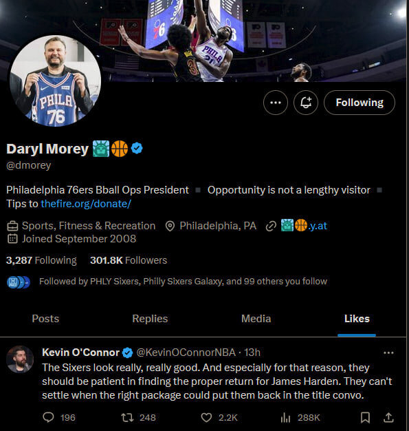 Дэрил Мори лайкнул твит, что «Сиксерс» надо ждать лучшее предложение по Джеймсу Хардену