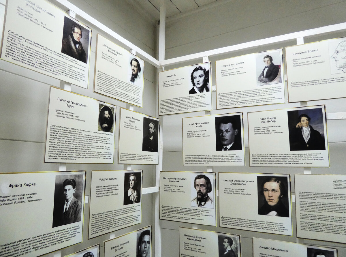Главная инсталляция — портреты с описанием биографий многих видных персонажей двух столетий. Писатель Франц Кафка, актриса Вивьен Ли, художник Амадео Модильяни, поэтесса Леся Украинка, лицейский друг Пушкина Вильгельм Кюхельбекер, литературный критик Николай Добролюбов... Что общего у всех этих людей? Причина смepти: их yбил туберкулёз.