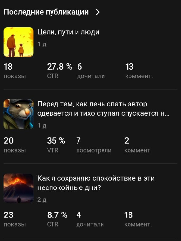 Но продолжали писать стабильно, сделали заголовки ярче, потом несколько упоминаний на своем основном канале. И показы закрутились даже на первых статьях.