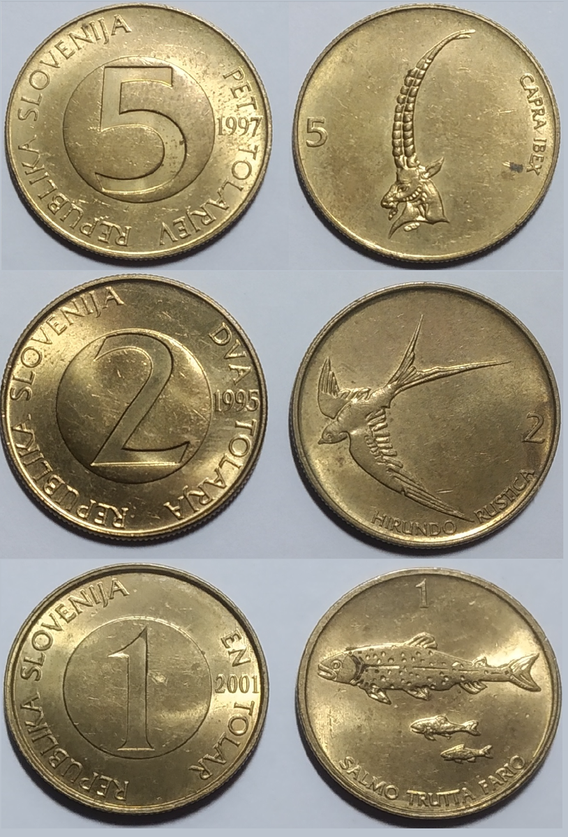 Привет, предлагаю к обзору монеты Словении - это 5, 2 и 1 Толар, выглядят они примерно вот так: Состав: 78 медь, 20 цинк, 2 процента никель Введены в обращение 4 января 1993 года Диаметр: 1 Толар - 22мм, 2 Толара - 24 мм, 5 Толаров - 26 мм Если смотреть более подробно, то на 5 Толарах в середине лицевой стороны монеты расположено изображение головы козерога, справа от нее на латыни написано название "Capra ibex" (в переводе горный козел), слева от заголовка обозначен номинал. На тыльной стороне монеты в центре рельефная круглая область с выбитой цифрой "5" по краю, слева - название "Республика Словения" с правой стороны слова, которые обозначают номинал "пять толар", и год выпуска монетного двора. На монете в 2 Толара в середине лицевой стороны монеты расположено изображение ласточки в полете, справа от нее по краю надпись со значением цифры; под ласточкой на латыни написано название "Hirundo rustica". Деревенская ласточка. На тыльной стороне монеты в центре рельефная круглая област