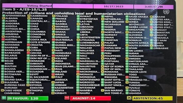 Буквально только что, на волне сообщений о начале наземной операции ЦАХАЛ в секторе Газа на заседании Генероальной ассамблеи ООН прошло голосование за предложенную арабскими странами резолюцию с призывом о прекращении огня. Полное название резолюции: «О защите гражданского населения и соблюдении правовых и гуманитарных обязательств» Результаты голосования на картинке. Зелеными — те страны, кто «за», красными — те, кто против, желтыми — воздержавшиеся. Как по мне, то с международной поддержкой Израиля всем все ясно. Беда только в том, что Израилю и стоящим за ним США на международную поддержку плевать, так же как Израиль плюет с высокой колокольни на резолюции о создании независимогоПалестинского арабского государства. А ООН все больше превращается пятое колесо мировой политики. Также, как в пятое колесо мировой политики превратилась Лига наций перед началом Второй мировой войны.