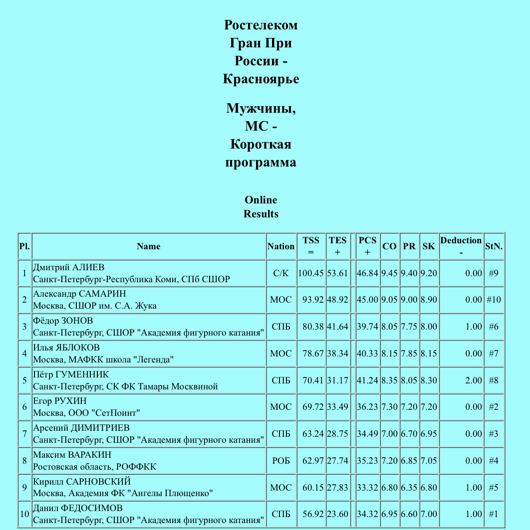 Завершились короткие программы у мужчин в рамках этапа российской серии Гран-при «Красноярье». Не могу сказать, что все участники порадовали. Но на это и соревнования. По итогам первого дня промежуточная турнирная таблица выглядит так: Егор Рухин. Спортсмен планировал начать программу с четверного сальхова, но исполнил лишь двойной и остался без элемента. Далее был неплохой каскад четверной тулуп-тройной тулуп и тройной аксель на две ноги, что сильно повлияло на GOE. 69.72 Кирилл Сарновский. Показалось, что волновался юноша перед прокатом. Вышел с испуганным взглядом. Не самый лучший прокат был. Упал с тройного акселя, ошибся на каскаде и получился лишь тройной лутц-двойной тулуп с помаркой. 60.15. Федор Зонов. Начал прокат с уверенно тройного акселя, далее последовало падение с четвертного риттбергера и помарка на каскаде тройной лутц- тройной тулуп (спортсмен сделал тройки между прыжками). Не смотря на помарки довольно уверенное катание, качественное скольжение…. Федя занимает проме