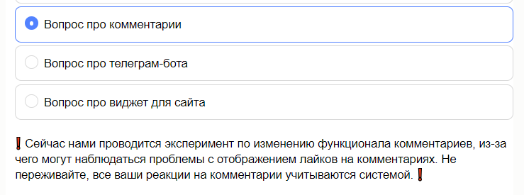 Вчера чуть не развелись. Поводов было целых два. Вечером я написал самую короткую в своей блогерской карьере статью о том, что немного устал жить без выходных: когда в будни - работаю на работе, а в выходные - дома, с ребенком. А утром Лина заметила, что я не поставил лайк её комментарию, где она спокойно, уверенно, почти без мата, поясняет мне и всем собравшимся, что в гробу она видела мои доводы о нехватке выходных. У неё вообще "отпуск по уходу за ребенком" почему-то не на море проходит. И на отпуск совсем не похож. И с ней сложно не согласится во всем, кроме одного - лайк-то я поставил её комментарию. И всем остальным комментариям тоже. А сегодня захожу, листаю статью, посты и вижу, что ни на одном комментарии нет моих лайков. Ни поставленных в мобильном приложении, ни на сайте. И подобное происходит уже не в первый раз. Сегодня я впервые хотел написать в службу поддержки по этому поводу, но, когда выбрал нужный мне вопрос, всплыла вот такая надпись: Получается, да - лайки исче