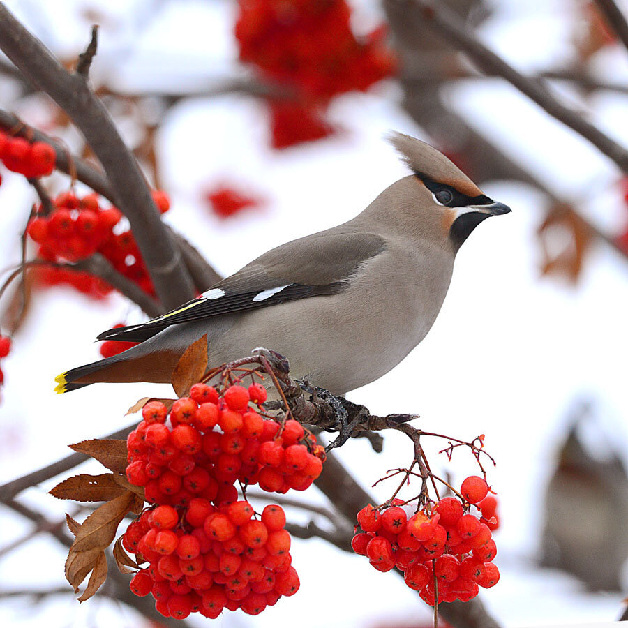 Сегодня на рябине я увидел свиристелей. Удивительные пепельно-розовые птицы с жёлтой полосой на хвосте, белыми полосками на крыльях и задорным хохолком на голове клевали потемневшие от мороза ягоды и негромко, но очень мелодично перекликались между собой. Словно какой-то добрый волшебник играл в холодной тишине на таинственной свирели.