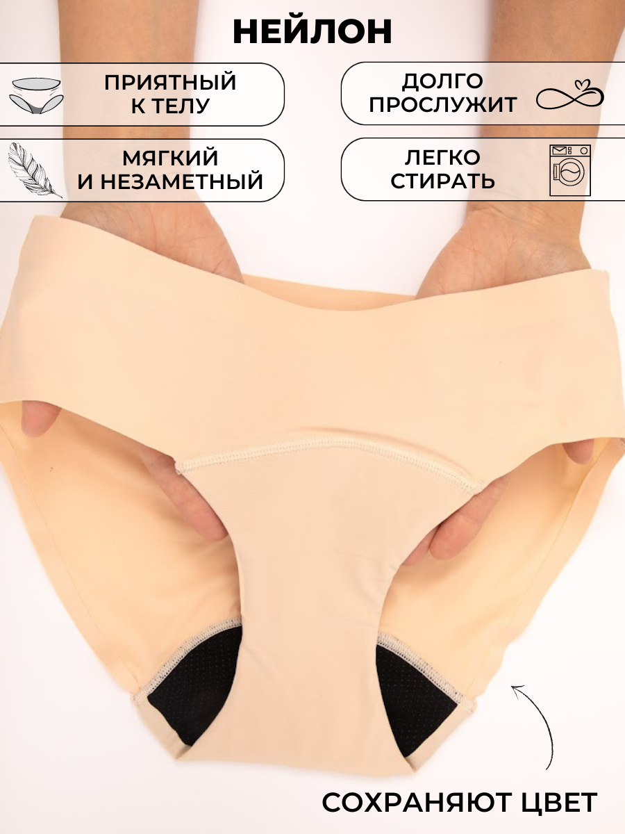Бесшовная конструкция менструальных трусов - одна из их главных особенностей. Это означает, что они не имеют никаких швов, которые могут вызывать дискомфорт или раздражение. Вместо этого, они имеют специальную ластовицу из гипоаллергенного, воздухопроницаемого материала, который обеспечивает комфортное прилегание к телу. Также внутри трусов расположен впитывающий слой, который удерживает выделения, и непромокаемый слой, который предотвращает протекания и запачкивание одежды.