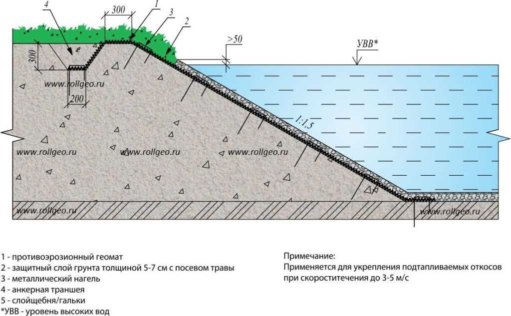 - Устройство геотекстиля. Геотекстиль необходим для предотвращения прорастания корней растений из пблизлежащей почвы, а также для защиты от проникновения грунта в водоем и образования мутности воды.