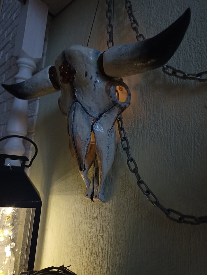 Череп быка для тематического дизайна. Могу сказать, что череп быка у многих народов - это оберег, символ жертвенности. Мне лично нравится эстетика североамериканских коренных народов, именно оттуда я взяла эту идею. На Руси череп коровы означал могущество природы. Основание сделала из коробки от молока и пластилина. Долго изучала строение черепа и лепила только верхнюю часть, она достаточно сложная. Рога сделала отдельно. Затем сверху всё покрыла фольгой и нанесла смесь для папье-маше из картонных коробок для яиц и клея пва, предварительно размочив упаковку в воде и размельчив блендером. Когда всё высохло, сняла картонную заготовку, покрыла клеевой шпаклевкой, отшлифовала. Ну а потом покрасила, инкрустировала янтарём, покрыла лаком. Мне понравился результат, хочу сделать ещё). Пост автора Elena.P. Читать комментарии на Пикабу.