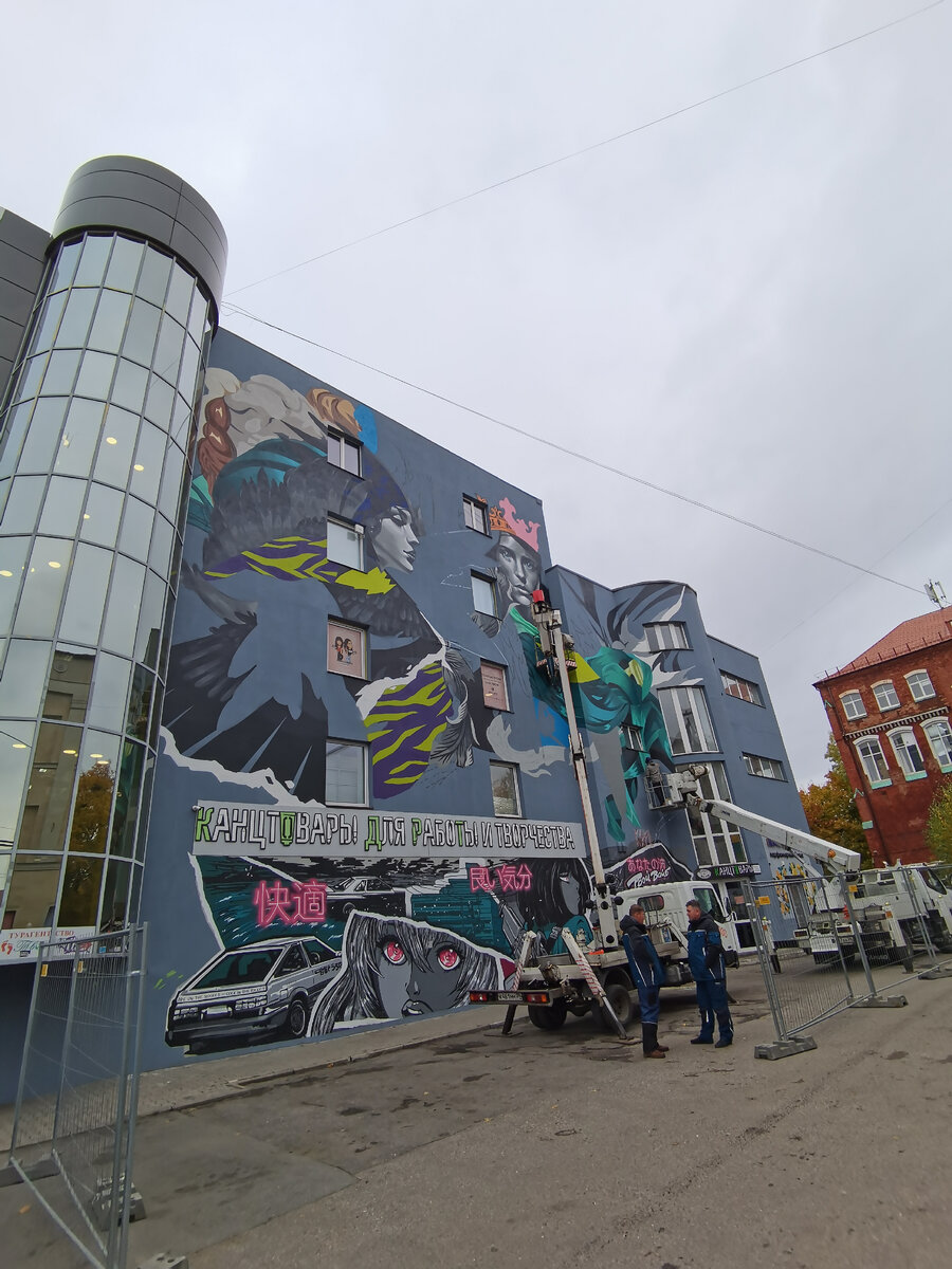 На боку торгового дома Европа (Ленинский проспект 7-9) прямо сейчас дорисовывают мурал