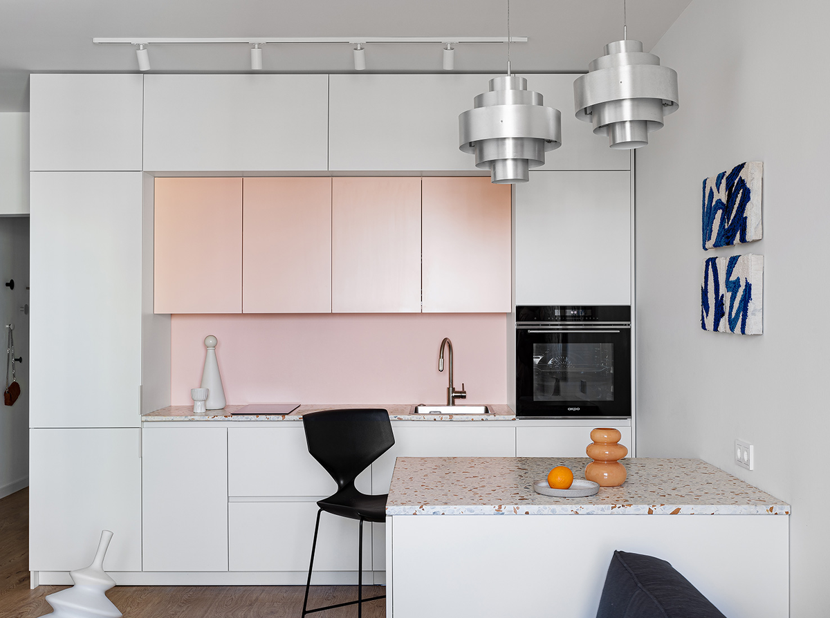 Этот проект начался для дизайнера Екатерины Алексейчик на этапе выбора квартиры для покупки. Преимуществами апартаментов в центре Минска были панорамный вид и свободная планировка, которая позволяла разместить отдельную спальню и гардеробную, несмотря на небольшую площадь в 51 кв. метр. «Владелица квартиры — девушка-фотограф, творческая личность со своим взглядом на мир, — рассказывает Екатерина. — Она хотела получить пространство, наполненное светом, интересными деталями и цветовыми акцентами, поскольку планировала использовать его не только для жизни, но и для фотосъемок». В результате планировки в квартире появились прихожая, гардеробная, ванная комната, пространство фотозоны со световым окном из спальни, кухня-гостиная, спальня и лоджия с рабочим местом. Квартира стала полноценным пространством для жизни и творчества, сочетающим в себе эстетику и функциональность, а также возможность трансформироваться в зависимости от сценариев съемок. «Заказчица, как и я, любит Италию, поэтому в