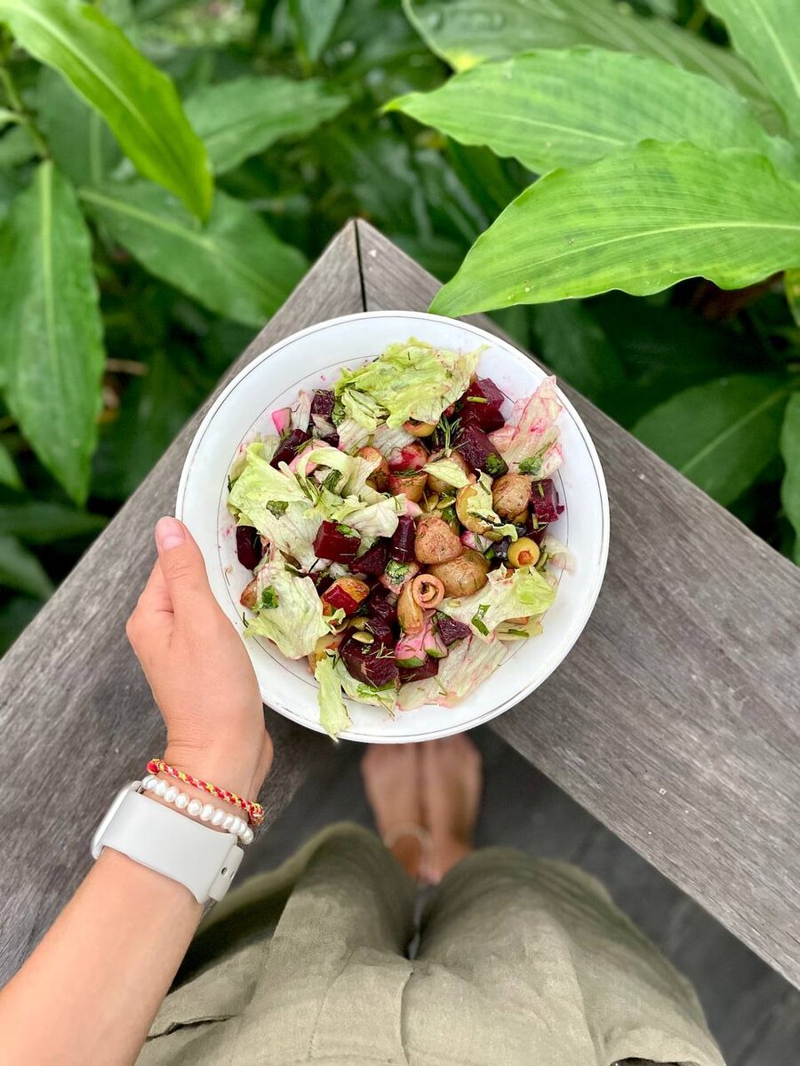 - Листья салата - Беби-картофель (можно и обычный) - Свекла - Огурцы - Оливки - Укроп и петрушка - Оливковое масло - Сок лимона - Тыквенные семечки Приготовление: 1. Заранее отварить свеклу до готовности. Так же до полуготовности отварить картофель. 2. Картофель разрезать на половинки и обжарить до хрустящей корочки. 3. Нарезать остальные ингредиенты и смешать их в салатнике, сбрызнуть лимонным соком, заправить маслом и посыпать сверху тыквенными семечками. Сытный и мега-вкусный салат готов!
