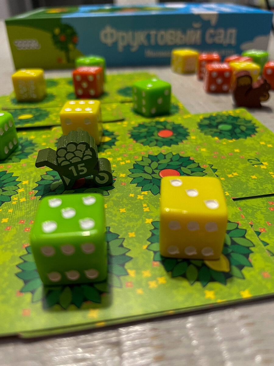 Выходные для меня — повод поменьше находиться на компьютером, и сегодня мы готовим, убираемся (ну выходные, сразу чувствуется 🤪) и играем в реальные настолки! Мне давненько уже приехала игра «Фруктовый сад», и это соло-настолка, чем я балуюсь редко. Но в первую очередь игра заинтересовала меня пространственной задачкой — такого плана, как в игре «Кофе» и «Корпорация „Смартфон“» (в общем, моё любимое наложение карт-тайлов друг на друга). В игре вам придётся накладывать карточки деревьев друг на друга, чтобы выращивать плоды на деревьях. Накладывая дерево с 1 лимоном на дерево с 2, вы получаете кубик с тройкой (3 лимона). Цель игры — навыращивать как можно больше фруктов (в игре есть разбалловка с результатами — сразу скажу, что до максимума я так и не добралась). Фрукты — по факту значения на кубике, и, казалось бы, больше 6 быть не может, но на одной из граней есть корзина с фруктами, если вы «повысили» шестёрку — это сразу 10 очков, а ещё тележка (если повысили наложением ещё одного