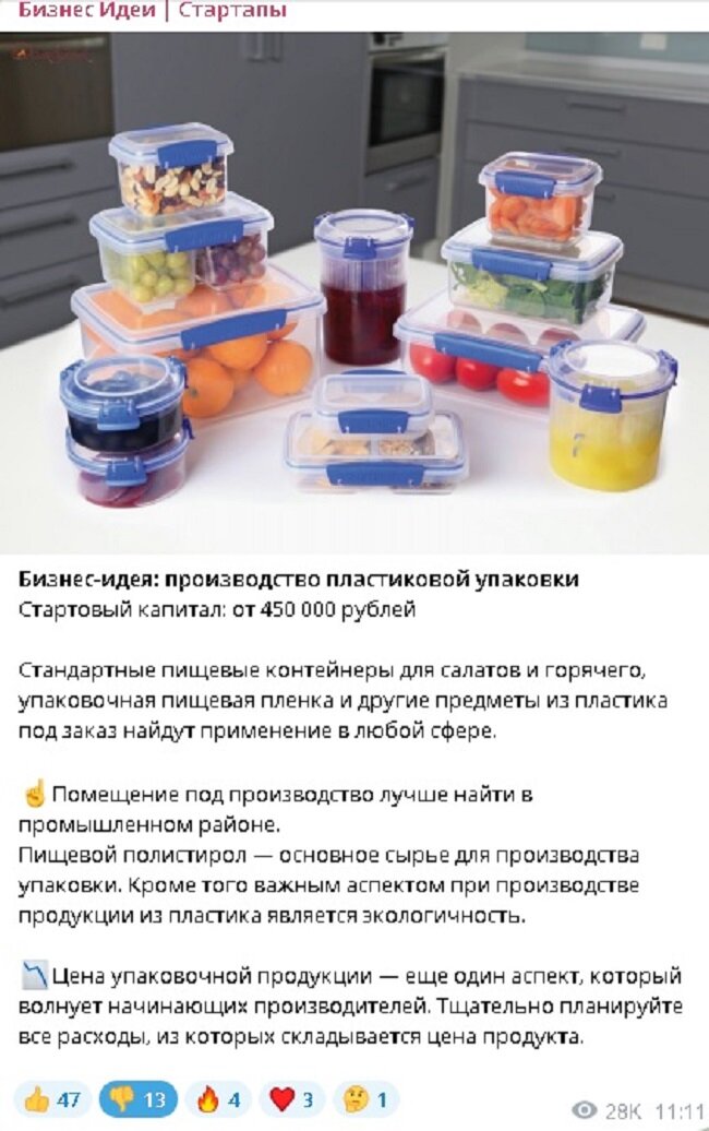 Недавно рассуждал на тему, почему так много объявлений о продаже бывшего в употреблении оборудования для переработки пластмасс есть в интернете. Возможно одной из причин являются вот такие вот бизнес-советчики. Главной "неправдой" в этой бизнес идее является стоимость запуска. Цифру взяли с потолка, не иначе. Ниже скриншот из одного телеграмм сообщества, на которое подписано почти 300 тысяч человек. Объясняю в двух пунктах, почему совет полное ... ерунда! 1. Материал изготовления. Контейнеры из полистирола? Ребята, это же ужас! Начну с того, что в него нельзя класть горячую пищу и греть в микроволновке. Во вторых. Российские экологи обвиняют подобную тару в небезопасности для человека и много лет пытаются её запретить. При нагревании из него будут выделяться вредные для человека вещества. Я бы даже о работе на таком производстве хорошо подумал. Рекомендую полипропилен. И контейнеры себе такие покупайте. Можно из ПВХ, но у него очень низкая температура деформации, имейте это ввиду. Все
