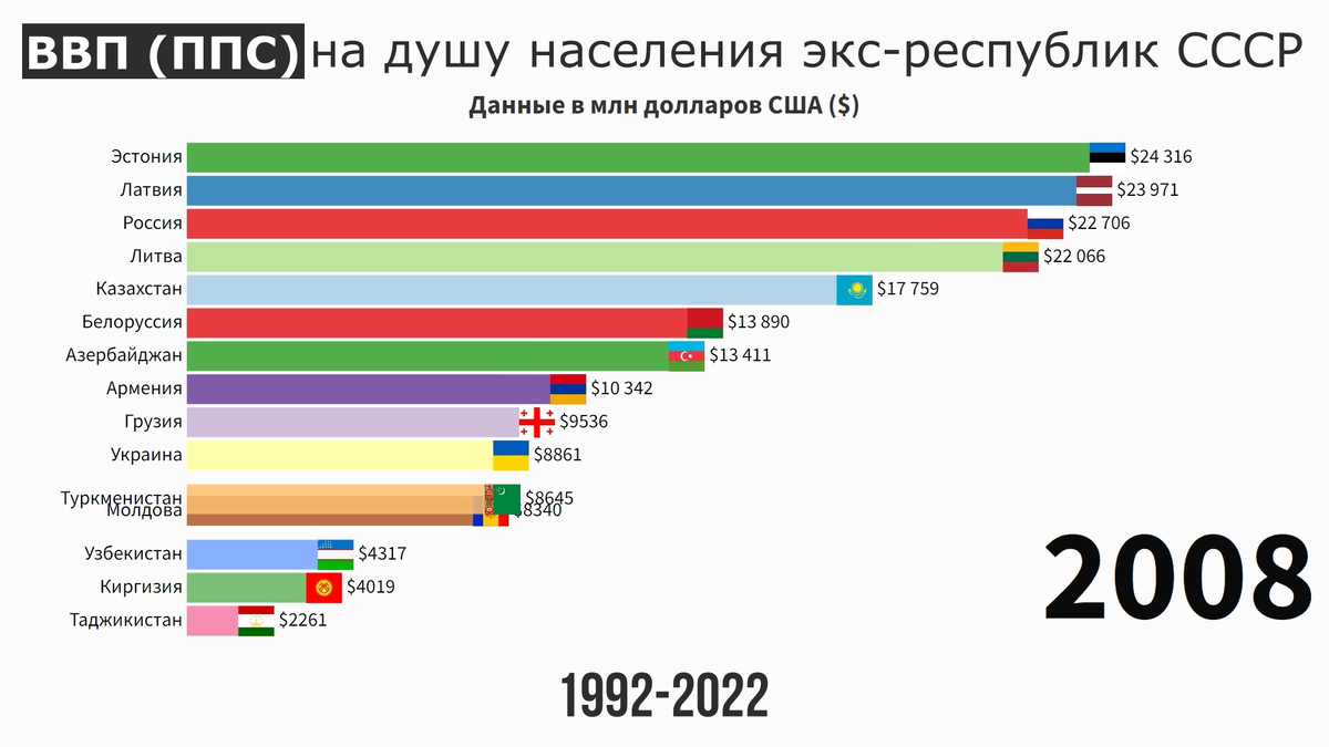 Обновленный рейтинг эск-республик СССР по ВВП(ППС) на душу населения (1992-2022)
