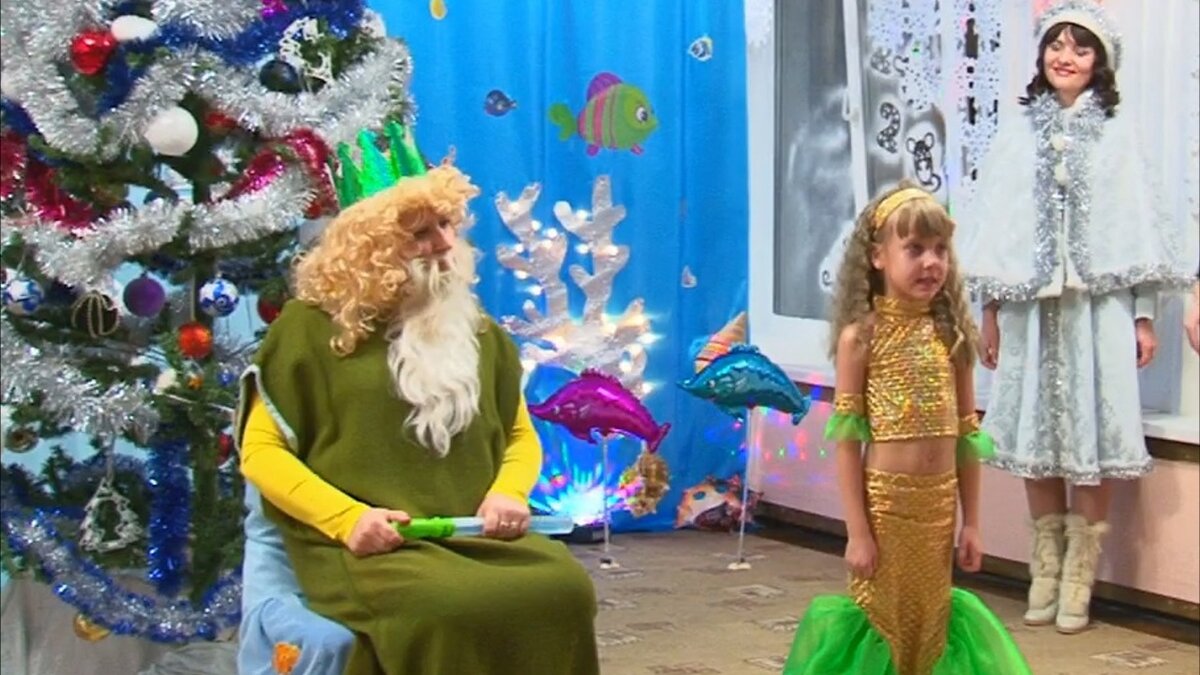 Новый год в подводном царстве хотя бы раз проводил, наверное, каждый музыкальный руководитель с мало-мальским опытом работы. Сценариев на эту тему в интернете пруд пруди. Вот и я несколько лет назад решила порадовать ребятишек подготовительной группы этим волшебным новогодним приключением. Сценариев хоть и много, но большим разнообразием они не отличаются. Но мы ведь знаем, что даже по одному и тому же сценарию праздники получаются у всех разные. Не буду перечислять причины, от которых это зависит, расскажу какой Новый год в Подводном царстве получился у нас. С теми, кто вдохновится, поделюсь комплектом материалов для оформления утренника. Информация для тех, кто впервые на моём канале. Воспитываю любовь к музыке у дошкольников почти 40 лет. Раньше делилась танцами и песнями в исполнении моих воспитанников, но, как оказалось, многим нужна помощь в подготовке утренников (подбор сценария, репертуара). Поэтому пишу эту статью. Дед Мороз и Снегурочка Царь Морской и Квакуня В группе было