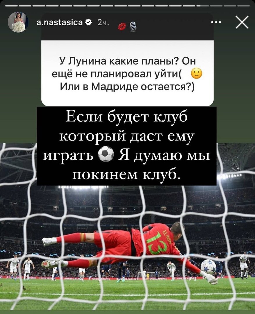 Андрей Лунин уже как пять лет является игроком «Реала». До 2020 года голкипер периодически уезжал в аренду, но в последнее время он сидит на лавке, изредка получая шанс встать в ворота мадридцев. Ожидалось, что Андрей покинет клуб этим летом, но Тибо Куртуа порвал кресты, и он вновь остался, надеясь стать основным. Однако «сливочные» подписали Кепу, и Лунину вновь пришлось дожидаться своей возможности. На фоне травмы испанца он все же смог выйти в стартовом составе в четвертом туре группового этапа ЛЧ против «Браги» и отстоял матч «на ноль». Но игрок все равно подумывает об уходе, о чем открыто заявила его жена Анастасия Томазова. Отвечая на вопросы подписчиков в своем инстаграме, девушка заявила, что, если представится возможность, «мы покинем клуб»: Анастасия — верная спутница Андрея. Пара познакомилась в Украине и вместе переехала в Испанию. В 2021 году они поженились, а в 2022 у пары родился сын.