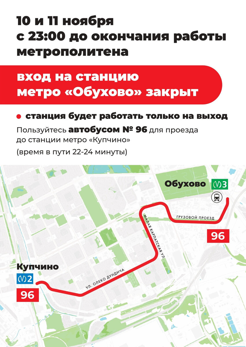 Станция метро «Обухово» на два дня меняет режим работы Наземный вестибюль станции метро «Обухово» в Невском районе Петербурга ближайшие два дня будет закрываться на вход почти на два часа раньше обычного. Об этом предупреждает пресс-служба ГУП «Петербургский метрополитен». В пятницу и субботу, 10–11 ноября, наземный вестибюль метро «Обухово» с 23:00 и до окончания работы станции будет закрыт для входа пассажиров. В качестве альтернативы пассажирам предлагают воспользоваться автобусом №96, чтобы доехать до станции «Купчино». На выход «Обухово» будет работать как обычно. Режим работы вестибюля изменят, чтобы оснастить станцию линейкой универсальных турникетов.