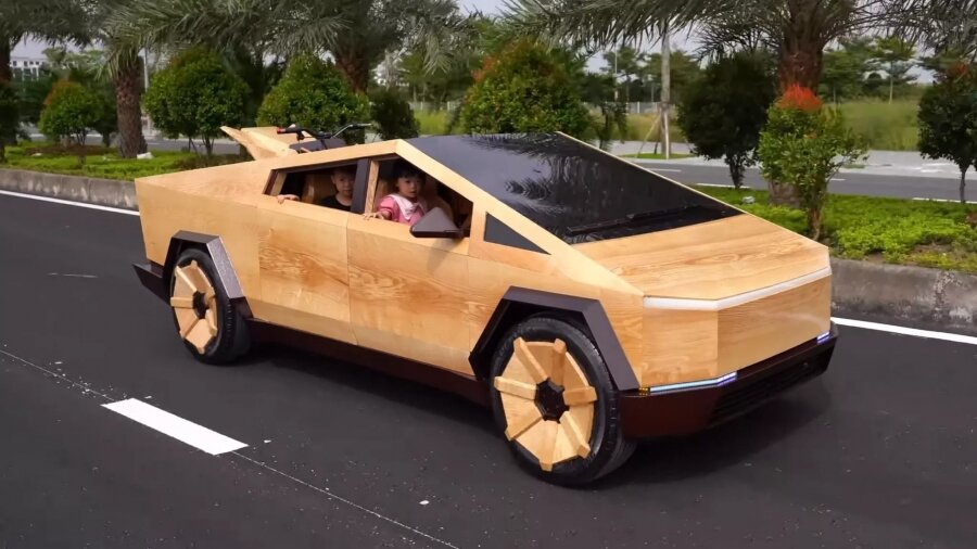 На свет появилась собственная версия электрического пикапа от неизвестного столяра из Вьетнама. Судя по всему, для полноты картины автору не хватало функционального Cybertruck с детализированным экстерьером и деревом в салоне. Именно поэтому им был создан квадроцикл из дерева под названием cyberquad. Стоит отметить, что изготовление деревянных автомобилей будто бы было потрачено 100 дней. Сначала в основу автомобиля укладывается металлический каркас, с помощью которого крепятся колеса и подвеска. Помимо этого пикап имеет аккумулятор и электродвигатель. Вьетнамец построил из дерева полностью рабочую копию пикапа Ford F150 Raptor. Темный бампер, крылья и боковые пороги имеют решётку из тёмного дерева. Они контрастируют со светлой отделкой основного кузова. Дизайнер разработал даже детализированные копии колесных дисков, зеркал заднего вида и функциональной оптики. А темные прозрачные панели повторяют плоское лобовое стекло с панорамной крышей по всему периметру автомобиля. Это может ост