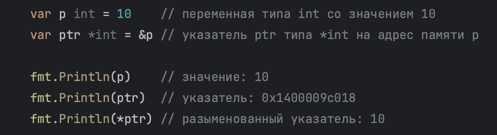 Для работы с указателями существует два оператора — амперсанд & и звёздочка *. Если перед именем переменной стоит амперсанд, значит мы хотим получить адрес этой переменной. Звездочка - это оператор разыменовывания. В примере указатель ptr не содержит значение переменной p типа int, а содержит только ее адрес. Адрес в памяти представляет собой шестнадцатеричное число, например, 0x1400009c018. Каждая программа при запуске создается в собственном пространстве памяти, указатель будет разным при каждом запуске, поэтому, если вы запустите код из примера, то адрес у вас будет другим. Изменение значения по указателю Переменная ptr указывает на адрес переменной str. Это означает, что если мы изменим значение, на которое указывает переменная ptr, мы также изменим значение переменной str. В конце мы установили для переменной-указателя ptr значение nil, тем самым освободим область памяти, выделенную под переменную ptr. Значение переменной str не изменилось. Передача по значению и по ссылке В Go