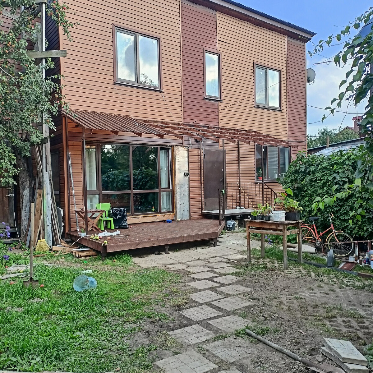 Решила показать поэтапно, как муж за один день собрал нам красивую веранду к дому. Немного предыстории: раньше на месте большого окна был гараж, поэтому вход в дом располагался справа,что не очень удобно в пользовании. Гараж мы ликвидировали, теперь у нас там комната и рояль😂 Встала необходимость формирования входной группы. Первым делом сняли плитку - потом из нее выложила тропинку к дому Опорами под фундамент послужили старые, но надёжные металлические трубы, вогнали в землю их метра на 1.5 На опоры наварили уголки, лаги встали как детальки детского конструктора. А вот и остальные лаги Пропитка, противопожарная и противогрибковая 🍄 Доску взяли в сетевом магазине, импрегнированная сосна ( дерево, пропитанное противогрибковыми препаратами под вакуумом, обеспечивая проникновение раствора глубже в слои древесины). У нас такая доска уже лет 10 на террасе на даче и все как новая. Да в общем-то и всё, всё готово!Можно пить чай! Чуть позже появился навес и будут ступеньки и огражден