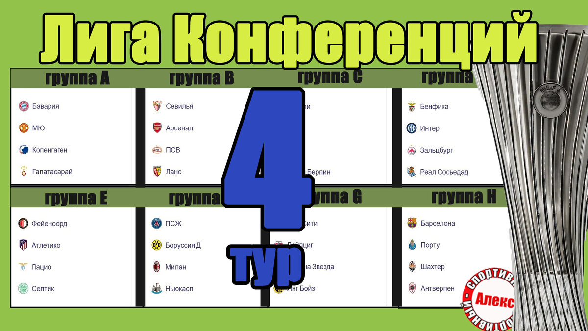 В Лиге Конференций состоялся 4-й тур. Первые участники вышли в плей-офф. Полный список в конце. Начинаю обзор с результатов группы А. Слован спас ничью с Лиллем 1-1. В последних 8 матчах Лилль сыграл хорошо – 4 победы и 4 ничьи. Олимпия взяла реванш у фарерского Клаксвика, забив дважды после 80-й минуты (2-0). Напомню, в первой игре Клаксвик одержал крупную победу на своём поле 3-0. Таблица. Лилль набрал 8 очков. У Слована – 7, У Клаксвика – 4, У Олимпии - первые 3 очка. Расписание. 5-й тур во всех группах пройдёт 30 ноября. В этот день Клаксвик примет Слован, Олимпия – Лилль. . Группа B. Брейдаблик уступил Генту 2-3. Игру фактически сделали два игрока. У исландца Сванторссона – дубль, у нигерийца Орбана – хет-трик. Заря уступила Маккаби Тель-Авив 1-3. Дор Перец забил дважды. Заря не побеждает с 20 октября на протяжении 4-х матчей. Таблица. Гент набрал 10 очков и за 2 тура до финиша на 6 очков опережает 3-ю Зарю. У Маккаби – 6 очков, Брейдаблик после 4-х игр ничего не набрал. Расписани