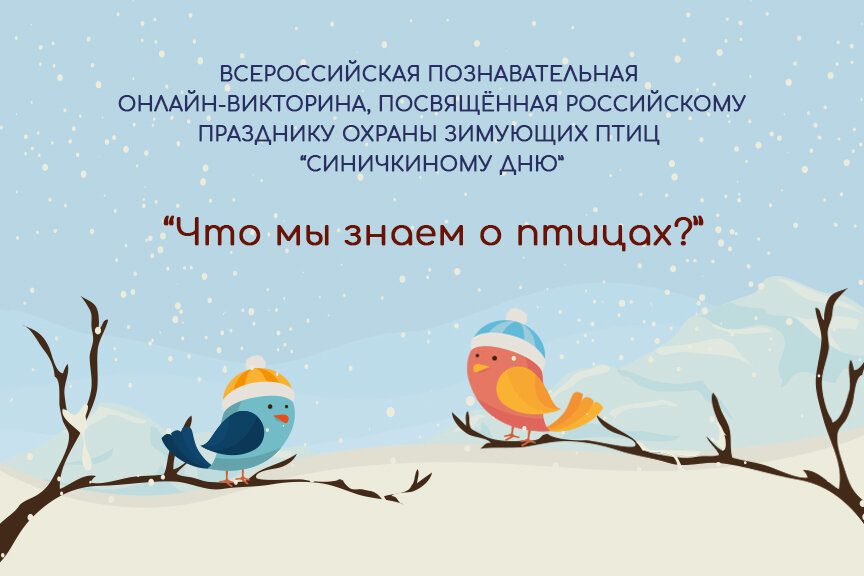 Приглашаем принять участие во Всероссийской познавательной онлайн-викторине, посвящённой российскому празднику охраны зимующих птиц «Что мы знаем о птицах?» Страница викторины: https://s-ba.ru/tpost/5hsi1xalu1-vserossiiskaya-pozna..