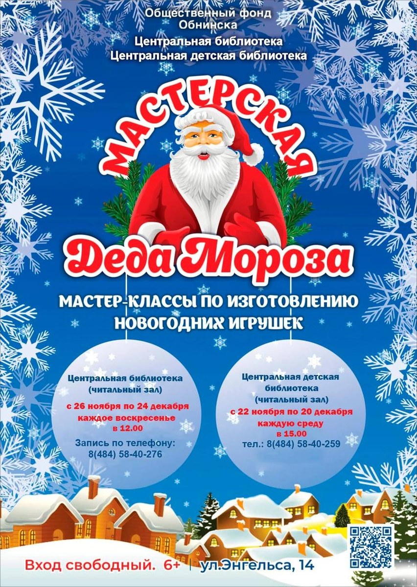 Мастер-классы будут проходить в Центральной библиотеке (г. Обнинск, ул. Энгельса, 14) Время мастер-классов: с 22.11.2023г по 24.12.2023г каждая среда в 15:00 и каждое воскресенье в 12:00 (2 этаж). Мастерская Деда Мороза приглашает всех желающих создать новогодние украшение своими руками. Оригинальные шары из ниток, игрушки из трубочек от коктейлей, фигурки животных из фетра. Материалы для изготовления покупать не нужно - всё предоставит библиотека. Эти игрушки украсят ёлочки на площади перед библиотекой.